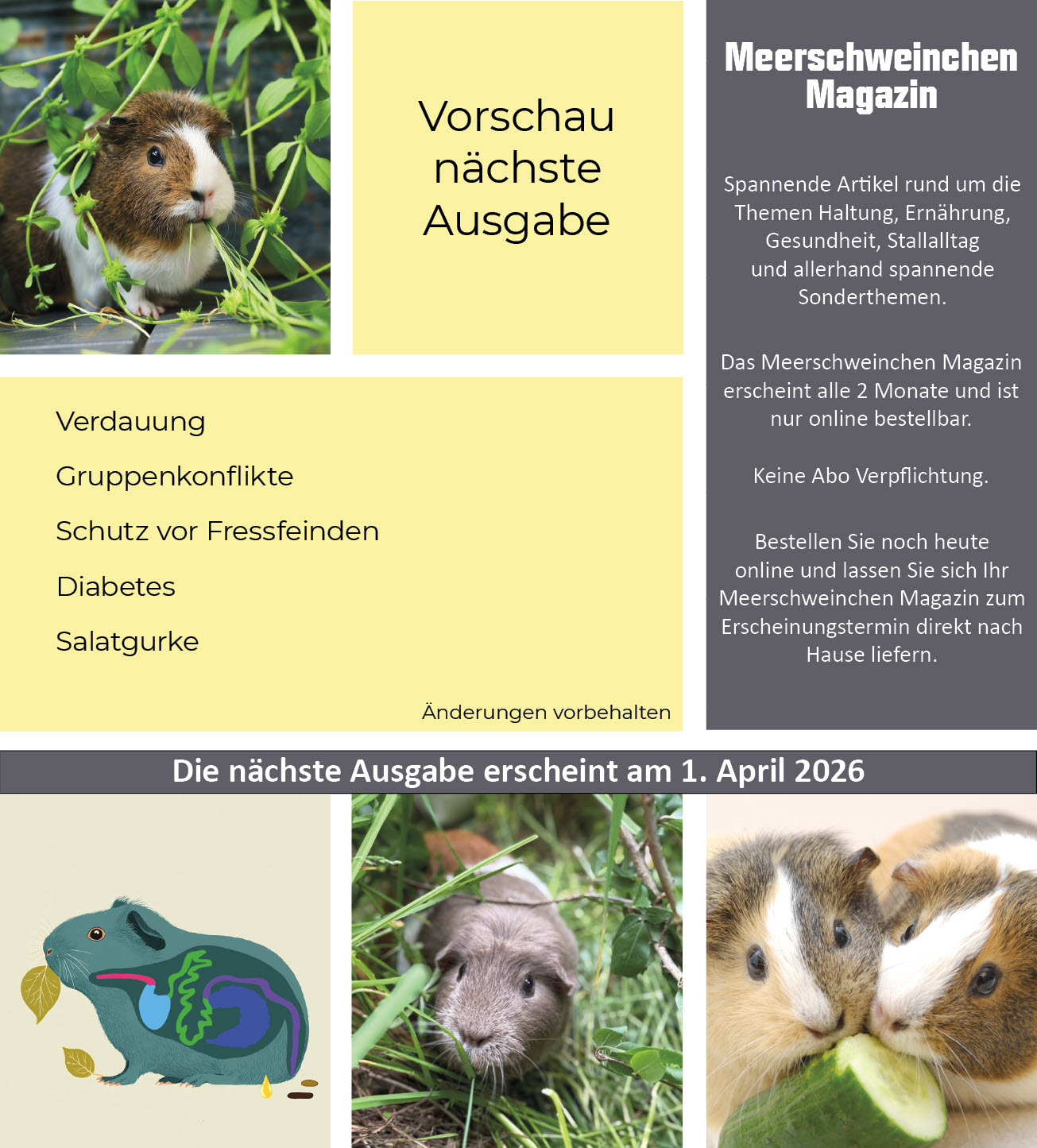Das Meerschweinchen Magazin erscheint alle 2 Monate. Sie können schon heute zukünftige Hefte vorbestellen. Die Hefte machen sich dann pünktlich zum jeweiligen Erscheinungstermin auf den Postweg zu Ihnen.
